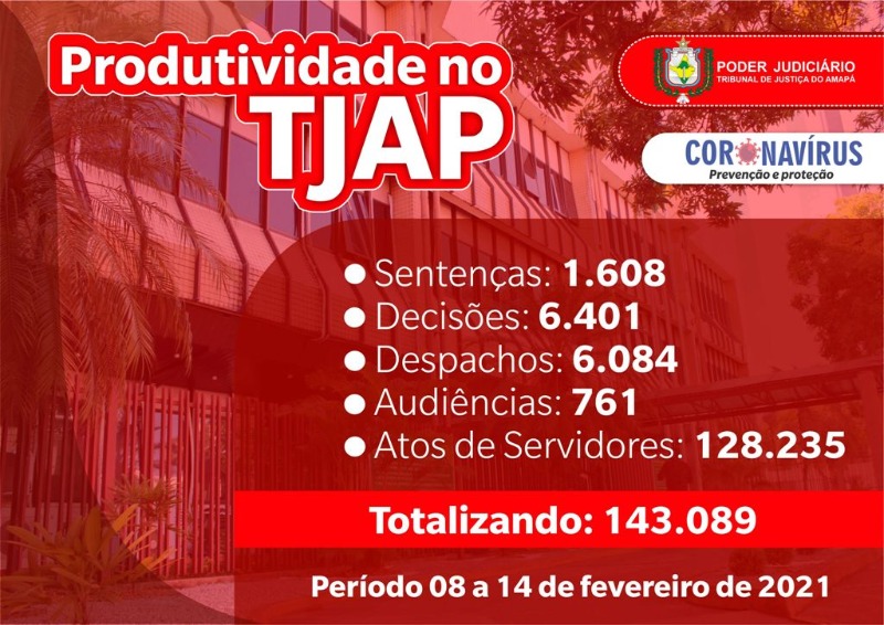 Do total, foram 128.235 atos cumpridos por servidores; 6.401 decisões; 6.084 despachos; 1.608 sentenças e 761 audiências. Os números de produtividade são encaminhados semanalmente ao Conselho Nacional de Justiça (CNJ) para aferição da prestação jurisdicional durante a pandemia do novo coronavírus. As informações são organizadas pela Secretaria de Gestão Processual e Eletrônica (SGPE/TJAP).