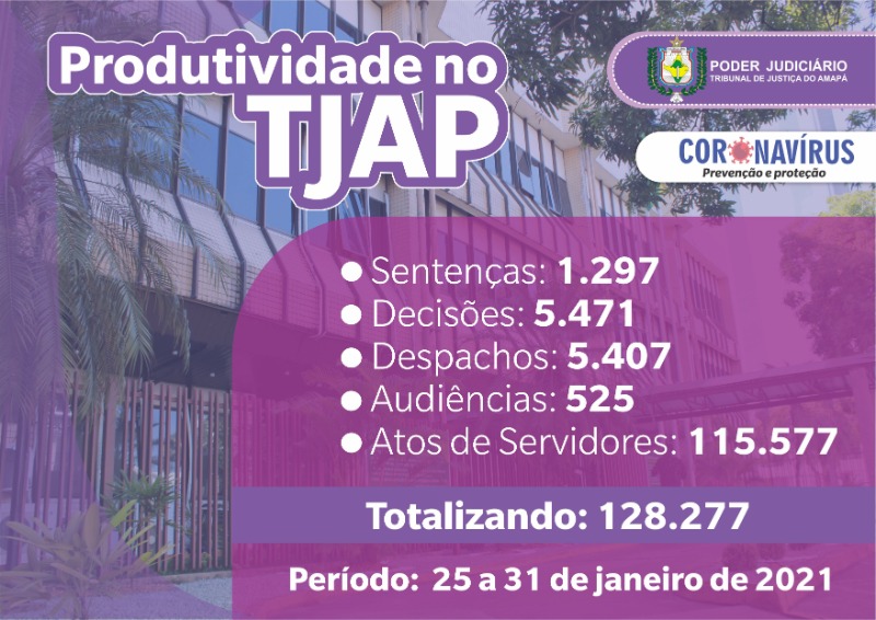 Mantendo o esforço contínuo para assegurar a prestação jurisdicional, diante das regras de distanciamento social impostas pela pandemia de Covid-19, o Poder Judiciário amapaense realizou 128.277 atos processuais no período de 25 a 31 de janeiro. As informações são prestadas semanalmente pela Secretaria de Gestão Processual Eletrônica (SGPE) ao Conselho Nacional de Justiça (CNJ) para aferição da prestação jurisdicional durante a pandemia de Covid-19.
