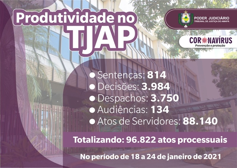 Durante esta última semana (18 a 24 de Janeiro), o Tribunal de Justiça do Amapá realizou 96.822 movimentações processuais, sendo: 88.140 atos processuais, 134 audiências, 3.984 decisões, 3.750 despachos e 814 sentenças. Os números são do relatório da Secretaria de Gestão Processual e Eletrônica (SGPE/TJAP), encaminhados semanalmente ao Conselho Nacional de Justiça (CNJ), para aferição da prestação jurisdicional durante a pandemia do coronavírus (Covid-19).