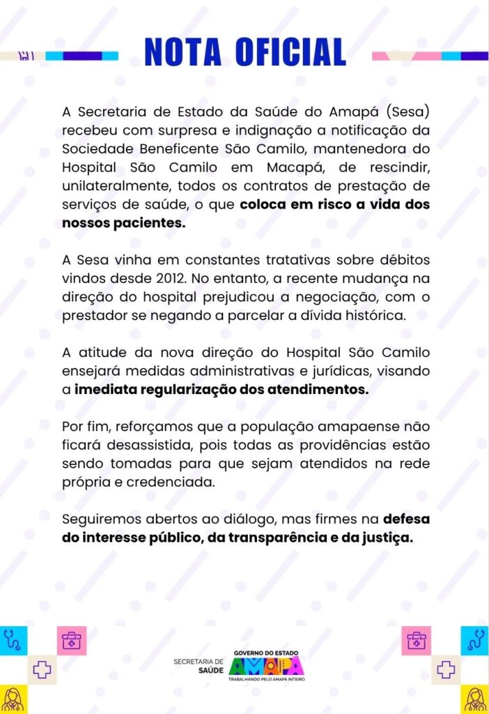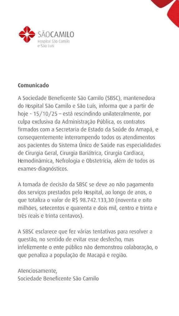 A Sociedade Beneficente São Camilo (SBSC), mantenedora do Hospital São Camilo e São Luís, comunicou oficialmente nesta quarta-feira (15) a rescisão unilateral dos contratos firmados com a Secretaria de Estado da Saúde do Amapá (Sesa).