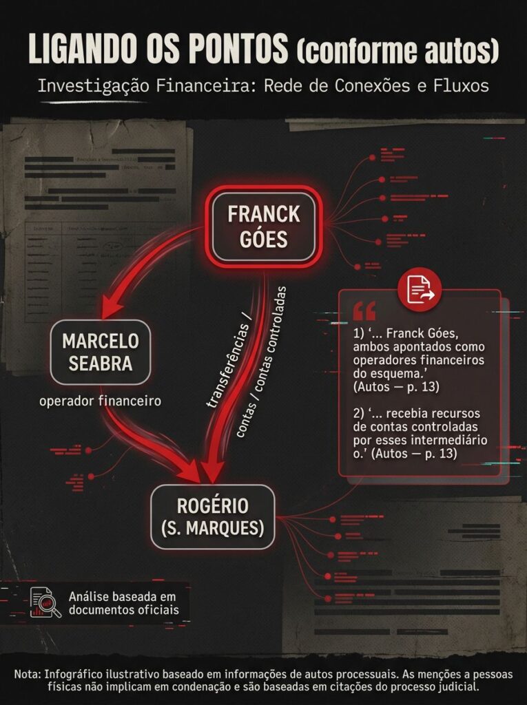 No trecho em que detalha a engrenagem financeira, a decisão registra uma conexão direta entre movimentações de réus e operações atribuídas a intermediários. O texto afirma que a movimentação financeira de um dos réus ocorreu “em conjunto com as operações realizadas” por Marcelo Seabra e Franck Góes, “ambos apontados como operadores financeiros do esquema”. Em seguida, registra que as transferências indicam recebimento de recursos oriundos de contas “controladas por esses intermediários”, elemento descrito como reforço de “integração ao circuito de lavagem”. É o núcleo documental mais direto sobre o papel atribuído a Franck no fluxo de valores: não como mero citado periférico, mas como agente descrito nos autos como operador do trânsito bancário que sustentaria o circuito de ocultação.