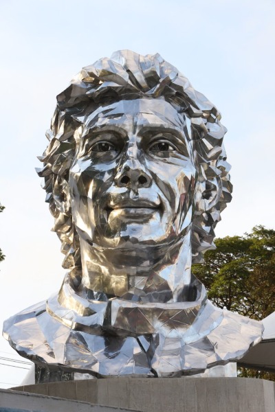 A escultura de Ayrton Senna tem mais de três metros de altura e pesa mais de 500 quilos. A obra chegou ao Autódromo de Interlagos para a última edição do Grande Prêmio de São Paulo de F-1, em comemoração aos 50 anos da primeira edição do evento, e agora será aberta ao público em geral.