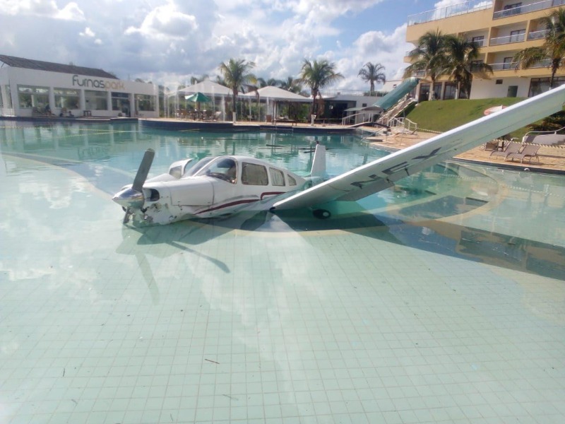 Um avião monomotor caiu na tarde de hoje dentro de uma piscina do Furnaspark Resort, às margens do Lago de Furnas, em Minas Gerais.
