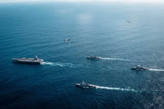 Marinha dos EUA exibe formação de porta-aviões em operação no Caribe