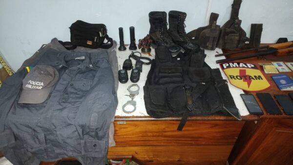 No local foram encontradas duas armas de fogo, do tipo espingarda, cartuchos, uma farda completa da Polícia Militar do Amapá, porções de drogas e diversos telefones celulares.