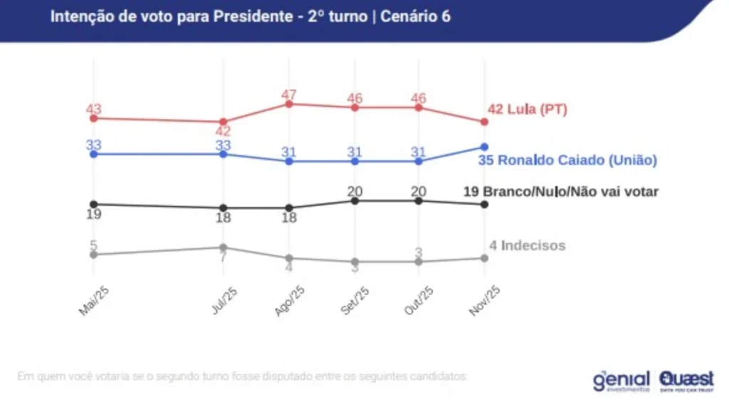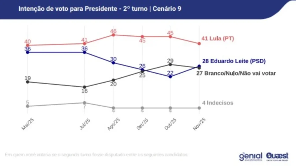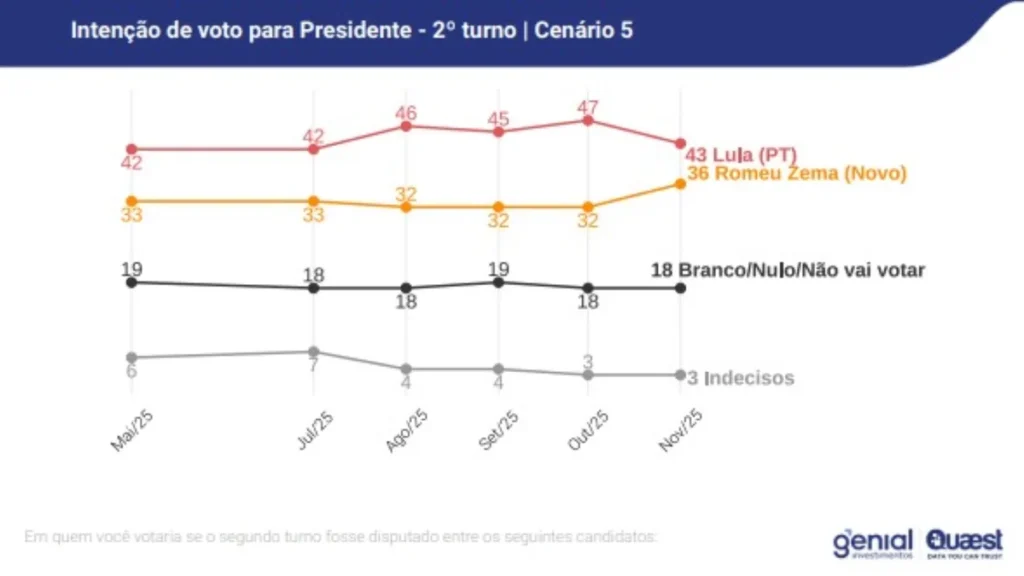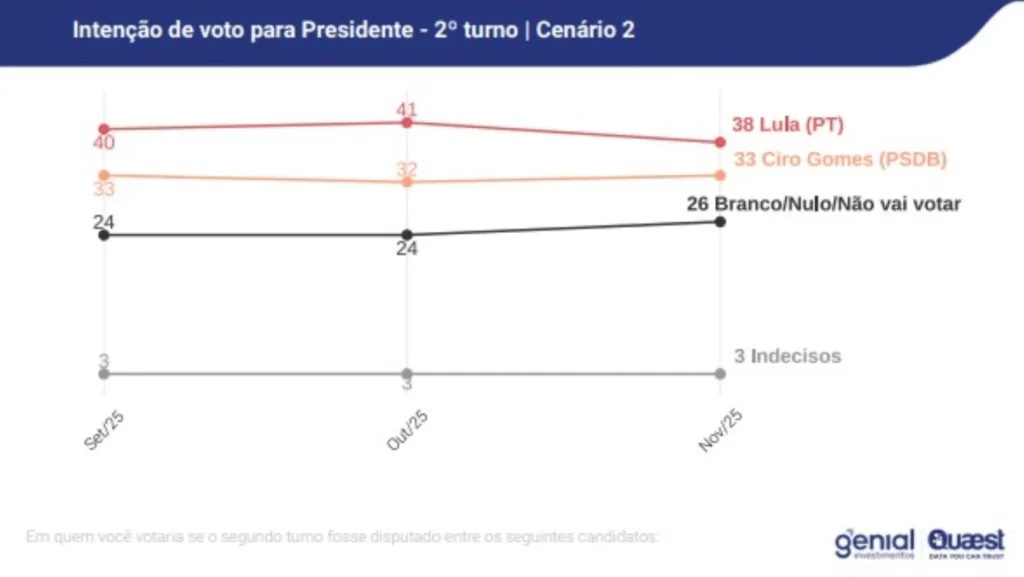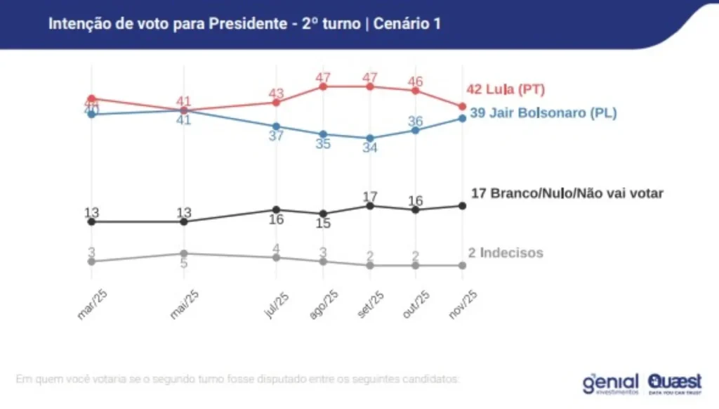 A nova rodada da pesquisa Genial/Quaest sobre intenções de voto para a Presidência da República em 2026, divulgada nesta quinta-feira (13/11), mostra o presidente Luiz Inácio Lula da Silva (PT) na liderança em todos os cenários de primeiro turno. O levantamento indica, também, que o petista continua à frente nas simulações de segundo turno, mas com margem menor do que a registrada na sondagem anterior, de outubro.