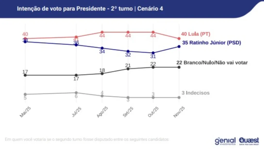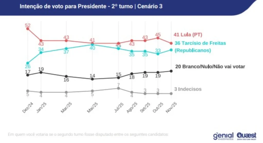 Nos cenários de segundo turno, Lula segue à frente em todas as simulações, mas com vantagem menor do que a registrada em outubro. Em relação ao levantamento anterior, o presidente perdeu entre dois e quatro pontos percentuais nas projeções, o que reduziu a distância que antes variava de nove a 23 pontos em relação aos adversários.