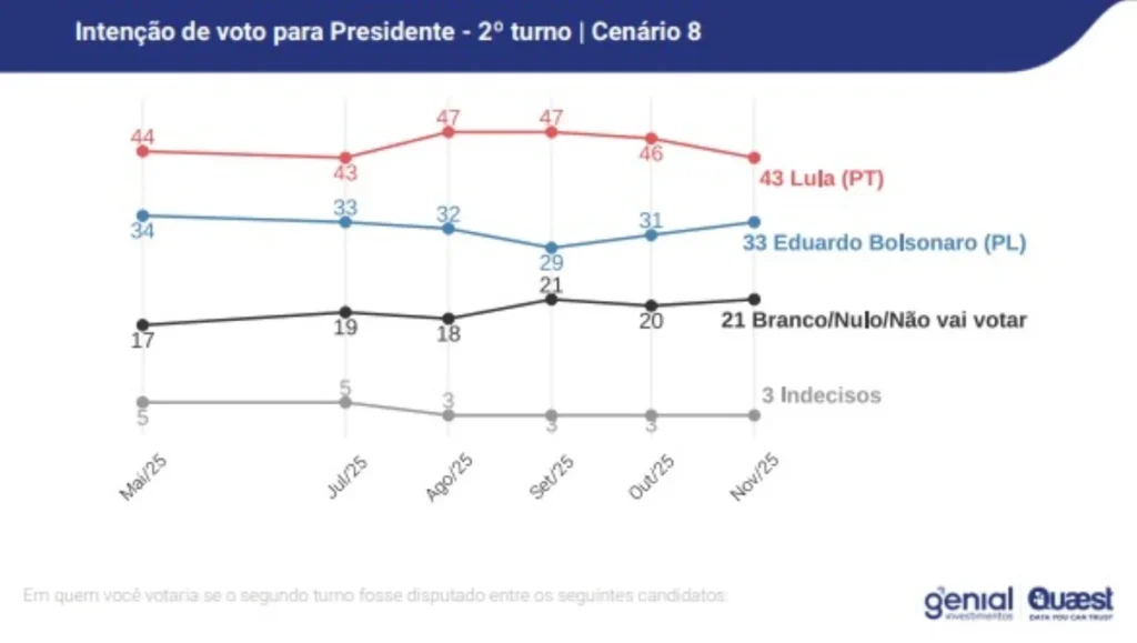A pesquisa Genial/Quaest foi realizada entre os dias 6 e 9 de novembro deste ano e ouviu 2.004 brasileiros com 16 anos ou mais. Os questionários foram realizados “face a face” em coleta domiciliar. O nível de confiança divulgado é de 95%, e a margem de erro estimada é de dois pontos percentuais.