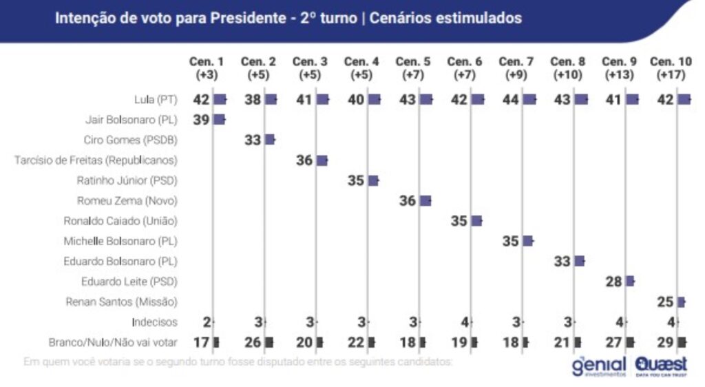 A pesquisa analisou 10 cenários de primeiro turno. No cenário número um, Lula aparece com 32% das intenções de voto contra 27% de Jair Bolsonaro (PL), que está inelegível. Em seguida, aparecem Ciro Gomes (PSDB), com 8%, Ratinho Júnior (PSD), com 7%, Ronaldo Caiado (União), com 4%, e Romeu Zema (Novo), com 3%. Outros 6% não souberam responder, e 12% declararam voto em branco, nulo ou que não pretendem votar.