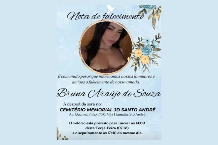 Bruna será velada às 14h e sepultada às 17h40 desta terça-feira (7/10) no cemitério Memorial Jardim Santo André.
