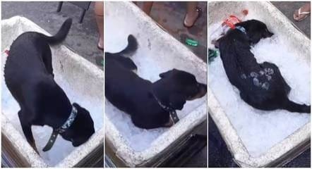 Um cachorro encontrou um jeito inusitado para se refrescar do forte calor que está fazendo no Rio de Janeiro. Um vídeo publicado nas redes sociais mostra o cão preto entrando em um isopor, cheio de gelo — usado por um grupo de amigos para colocar as bebidas —, e deitando, tranquilamente. “Será que está quente?”, brincou a pessoa responsável pelo registro.