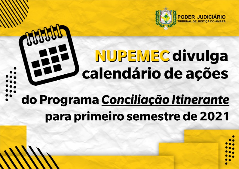 O Programa Conciliação Itinerante, promovido pelo Tribunal de Justiça do Amapá, por meio do Núcleo Permanente de Métodos Consensuais de Solução de Conflitos (Nupemec/TJAP), divulga o calendário de atividades programadas para o primeiro semestre de 2021. A primeira ação acontecerá no dia 12 de fevereiro, atendendo a comunidade de Abacate da Pedreira e arredores. Ainda em fevereiro, outras duas edições do programa serão realizadas, uma no Mercado Central e outra na Sede da Secretaria de Estado do Meio Ambiente – SEMA, tendo como foco um mutirão de Negociação Ambiental.