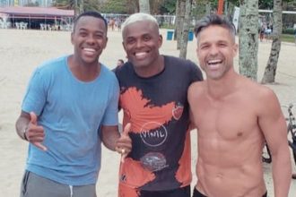 Sorridente, condenado, por estupro, a nove anos de prisão, na Itália, Robinho segue livre no Brasil. Domingo, futevôlei com Diego Ribas
