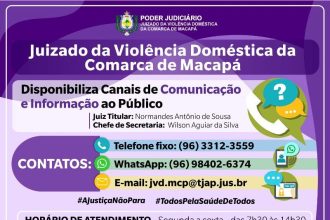 Juizado da Violência Doméstica e Familiar Contra a Mulher da Comarca de Macapá/Ap disponibiliza canais de atendimento ao público.