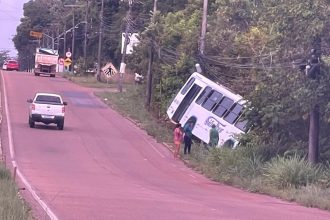 Ônibus tomba para fora da pista e deixa passageira ferida em Macapá.