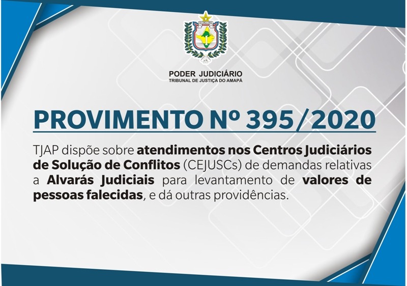 A Corregedoria-Geral do Tribunal de Justiça do Amapá, que tem como titular o desembargador Carmo Antônio de Souza, editou o Provimento Nº 395/2020–CGJ-TJAP, que autoriza os Centros Judiciários de Solução de Conflitos (CEJUSCs) a realizarem sessões de conciliação e/ou mediaçãoem demandas pré-processuais relativas a Alvarás Judiciaispara levantamento de valores de pessoas falecidas, desde que preenchidos os requisitos legais, inclusive do Decreto nº 85.845/81 que regulamenta a Lei n. 6.858/80. As sessões incluirão lançamento de sentença após a oitiva do Ministério Público do Amapá (MP-AP), quando for o caso.