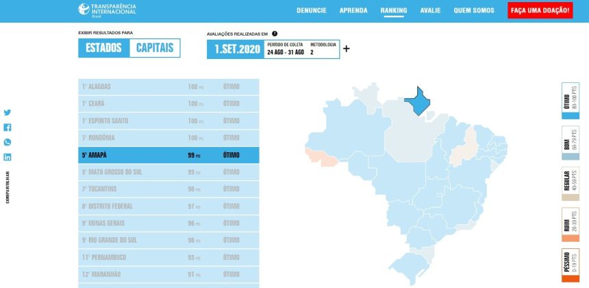 O Governo do Amapá alcançou 99 pontos no ranking da organização Transparência Internacional, que avalia como os portais da transparência estaduais divulgam informações sobre ações de enfrentamento à covid-19, como contratações emergenciais e medidas de estímulo econômico e proteção social.