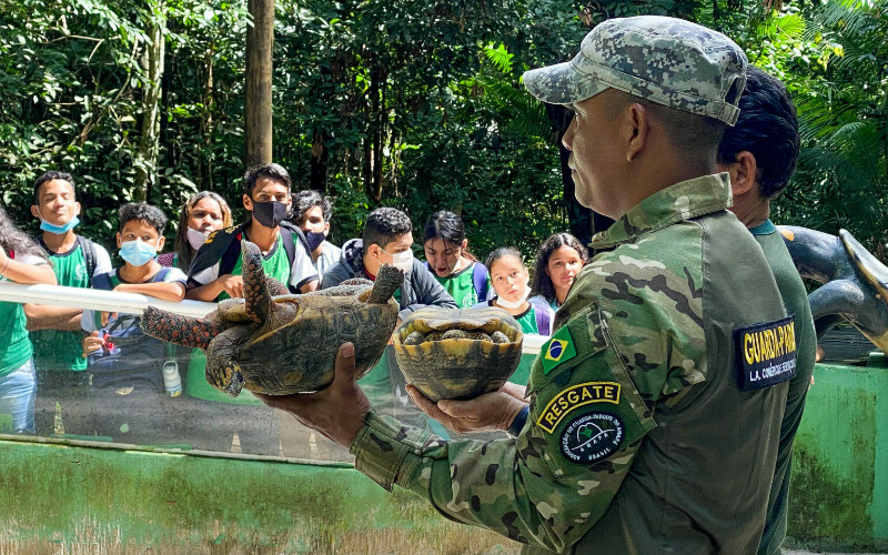 Os estudantes percorreram os principais espaços da unidade até o logradouro dos jabutis carumbé de pé vermelho, aperemas, tartarugas da Amazônia e tracajás. A aluna Isabela Abreu dos Reis, de 13 anos, acompanhou atenta a explicação do guarda-parque acerca da importância da conservação do meio ambiente.