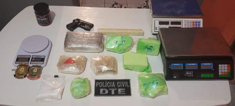 Na madrugada desta quarta-feira, 24, a Polícia Civil por meio da Delegacia de Tóxicos e Entorpecentes (DTE), prendeu, em flagrante, um homem por tráfico de drogas e realizou a apreensão de 4,5 kg de cocaína, crack e um simulacro de arma de fogo, em uma casa, localizada no bairro Novo Horizonte.