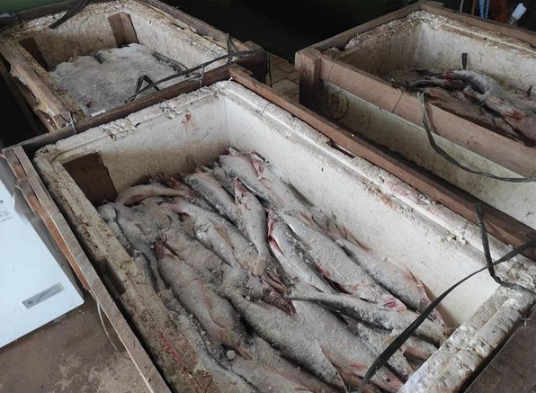 Os peixes estavam armazenados em sete caixas térmicas, cinco delas foram encontradas na carroceria de um veículo, e as outras duas estavam em uma pequena embarcação.