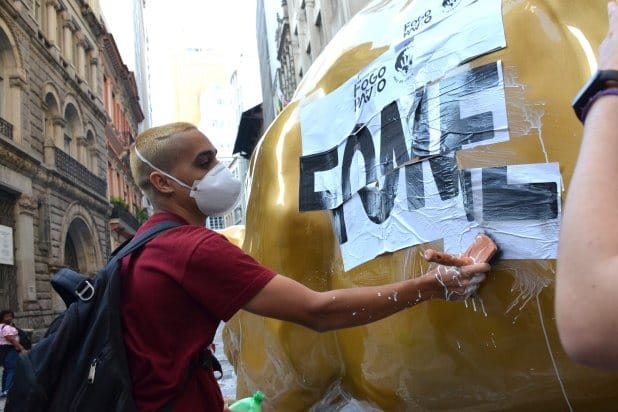 Nas redes sociais, o grupo de manifestantes divulgou uma nota afirmando que a escultura é símbolo da “fome, da miséria e da superexploração do trabalho”.