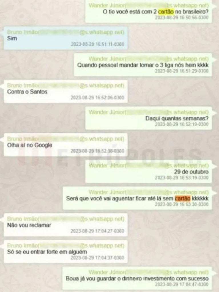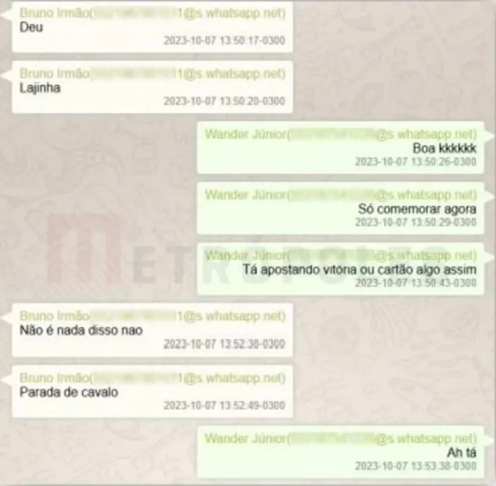 Bruno e o irmão, Wander — também alvo da operação da PF em novembro do ano passado — trocaram mensagens em 29 de agosto, quando Wander questionou o irmão sobre ele estar pendurado no Brasileirão. O indiciamento foi revelado com exclusividade pelo Metrópoles. - Para a PF, as trocas de mensagens indicam que Bruno Henrique teria passado ao irmão informações antecipadas sobre o recebimento de cartão amarelo no confronto contra o Santos.