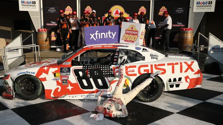 O líder da NASCAR Xfinity Series, Connor Zilisch, viveu um misto de alegria e dor no último sábado (9). Após conquistar mais uma vitória, no circuito de Watkins Glen International, em Nova York, o jovem de 19 anos acabou sofrendo uma queda durante a comemoração e quebrou a clavícula.