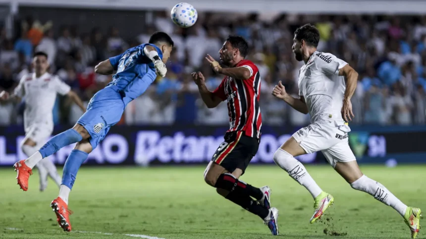 A pressão tricolor surtiu efeito aos 20 minutos. Maik acionou Lucas Moura pela direita, o meia cruzou com precisão e Calleri subiu mais alto que a defesa para empatar o clássico de cabeça. O gol esfriou o ímpeto santista e deixou o jogo mais aberto.