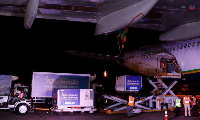 As vacinas prontas foram fabricadas pelo Instituto Serum, na Índia, e eram aguardadas desde sábado (16), mas tiverem atraso no envio por questões internas da Índia.