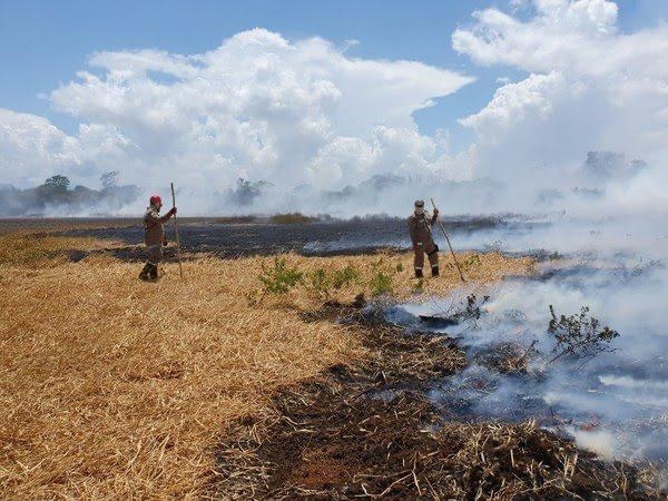 “É uma área bem extensa, com muito capim seco acumulado e devido ao tempo, ele queimou. A gente está fazendo a proteção para que o fogo não se espalhe. Combatemos as chamas, mas o acúmulo do capim seco, um em cima do outro, no meio do incêndio continua fumaçando”, relatou o tenente Elizeu, do 4º Grupamento Bombeiro Militar.