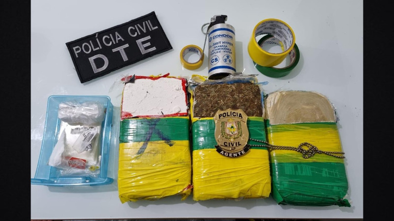 O homem preso em flagrante, que já passou quatro anos no Iapen pela prática de dois crimes de roubo, estava guardando três quilos de drogas, sendo um quilo de crack, um quilo de cocaína e um quilo de skank, além de uma granada de gás lacrimogêneo.