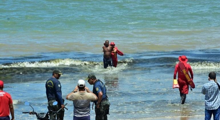 Um banhista foi retirado à força do mar e preso após entrar em uma área interditada, onde há risco de ataques de tubarão, na Praia de Piedade, no município de Jaboatão dos Guararapes, na região metropolitana de Recife, na tarde deste sábado (11).