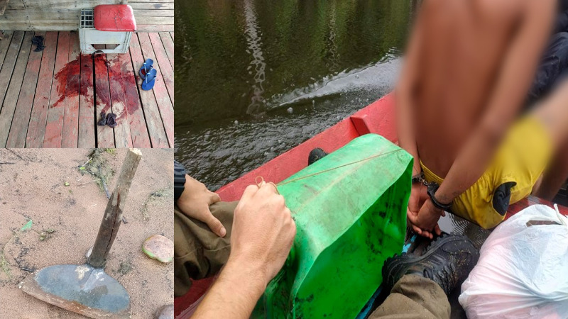 O investigado, usando uma enxada, desferiu golpes na cabeça da vítima, um homem de 51 anos de idade. Em seguida, roubou um botijão de gás, uma roçadeira e uma motosserra, que estavam na casa da vítima. O investigado fugiu e estava escondido em um terreno distante do local do crime, sendo necessário trabalho investigativo e diligências fluviais para a realização da prisão dele.