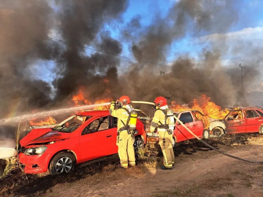 O fogo teve início no terreno ao lado e acabou se alastrando para dentro do pátio, gerando inúmeros danos nos veículos apreendidos.