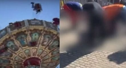 A mulher estava no brinquedo chamado Wave Swinguer, que é uma variação do carrossel, em que os assentos, presos por uma espécie de corda, giram no alto.