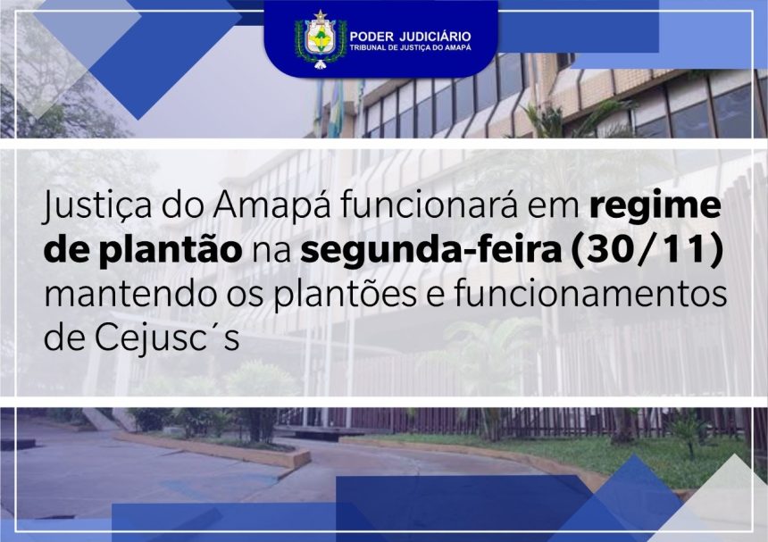De acordo com a Portaria 61044/2020 , que divulga os feriados e pontos facultativos Nacionais, Estaduais, Municipais e Regimentais nos Órgãos do Poder Judiciário do Estado do Amapá, na segunda-feira, 30 de novembro, Dia do Evangélico, a Justiça do Amapá não terá expediente. Mas, ficam mantidos os plantões e funcionamentos de Centros Judiciários de Solução de Conflitos, unidades que executam a Semana Nacional de Conciliação que tem início no dia 30 em todos os tribunais do Brasil.