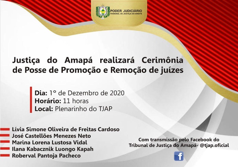 Nesta terça-feira (1º/12), às 11 horas, no Plenário da Câmara Única do Tribunal de Justiça do Amapá (TJAP), o desembargador-presidente João Lages dará posse a cinco magistrados que passaram por remoção e promoção na carreira, conforme a Resolução nº 1.408/2020-TJAP. A movimentação na carreira da magistratura estadual decorre da aposentadoria do juiz Luiz Nazareno Borges Hausseler, que gerou vacância na 1ª Vara do Tribunal do Júri de Macapá. A cerimônia será transmitida pela página do TJAP no Facebook.