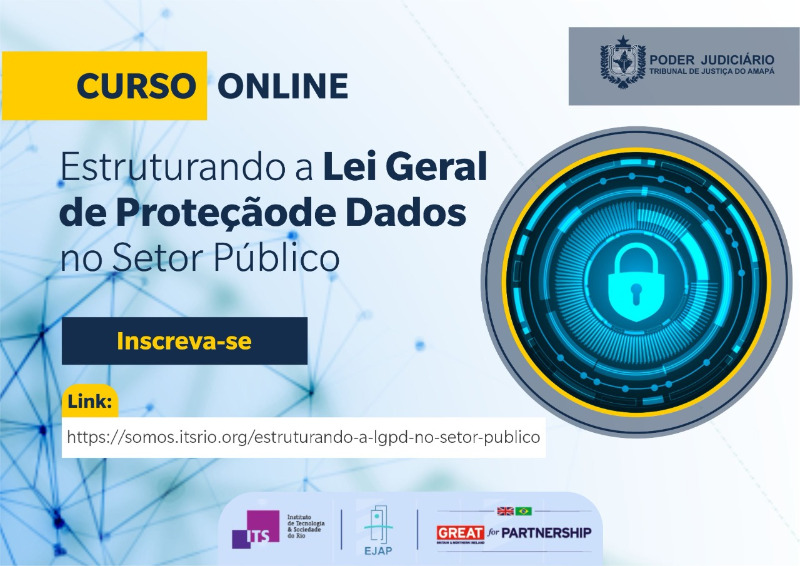 A Escola Judicial do Amapá (EJAP), em parceria com o Instituto de Tecnologia e Sociedade do Rio de Janeiro (ITS Rio) e o Governo do Reino Unido, realizará nos dias 30 e 31 de março, o curso virtual sobre a Lei Geral de Proteção de Dados (LGPD) no Setor Público. Voltado a magistrados e servidores do Tribunal de Justiça do Estado do Amapá (TJAP), o curso tem o objetivo de capacitar profissionais para atuar frente ao desafio de proteger os dados pessoais no dia a dia e tem carga de seis horas/aula. Com mentoria do professor João Archegas, mestre em Direito pela Universidade de Harvard e pesquisador no Instituto de Tecnologia e Sociedade do Rio de Janeiro, as inscrições são gratuitas. Basta acessar o link e preencher o formulário: https://somos.itsrio.org/estruturando-a-lgpd-no-setor-publico