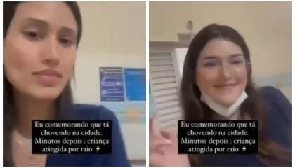 A legenda do vídeo dá a entender que a criança foi atingida por um raio. Elas se perguntam quem vai fazer o atendimento da criança e comparam os gritos do paciente como se ele estivesse sendo “exorcizado”.