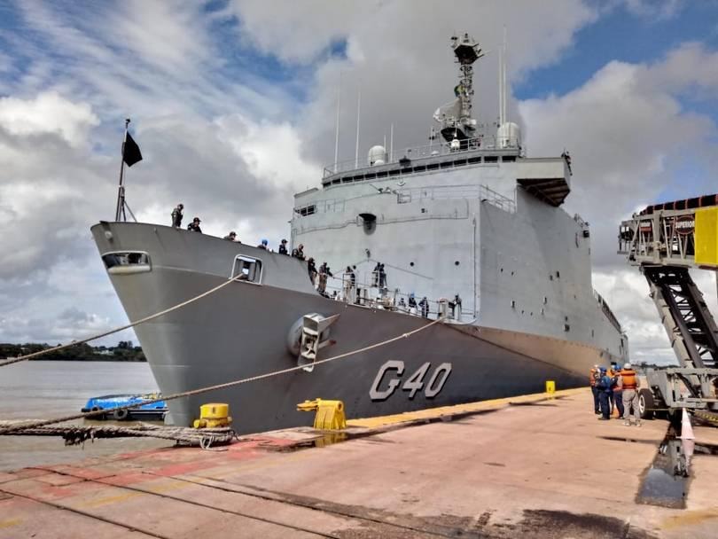 O Navio Doca Multipropósito “Bahia” chegou, nesta quarta-feira(11), ao Porto de Santana – AP para, em decorrência da falta de energia no Estado do Amapá, prestar apoio com militares da área de saúde, que serão empregados no atendimento à população no Centro de Triagem, anexo ao Hospital de Emergência. O Navio está fazendo parte da Operação “Amapá”, na qual a Marinha do Brasil está empregando três Navios; o Navio-Auxiliar “Pará” (U15) e o Navio Patrulha “Guanabara” (P48), ambos subordinados ao Comando do 4o Distrito Naval; e o Navio Doca Multipropósito “Bahia” (G40), que estava participando da “Operação AZUVER – Portal da Amazônia – Verde Brasil 2 e Ágata”; Helicópteros UH-15 Super Cougar , além de tropas de Fuzileiros Navais.