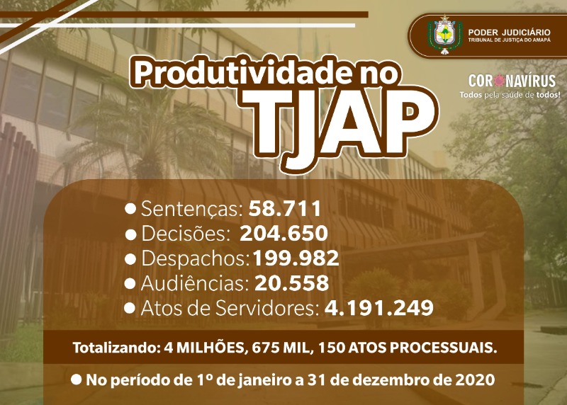 Foram nove meses de restrições para o funcionamento das instituições públicas e privadas no cumprimento das medidas de segurança sanitária impostas pela pandemia do novo coronavírus. A Justiça do Amapá se reinventou utilizando ferramentas digitais e inteligência artificial para manter a prestação jurisdicional. O resultado do esforço tecnológico aliado ao compromisso profissional de magistrados e servidores, é a marca de 4.675.150 (quatro milhões, seiscentos e setenta e cinco mil, cento e cinquenta) atos processuais de 1º de janeiro a 31 de dezembro de 2020.