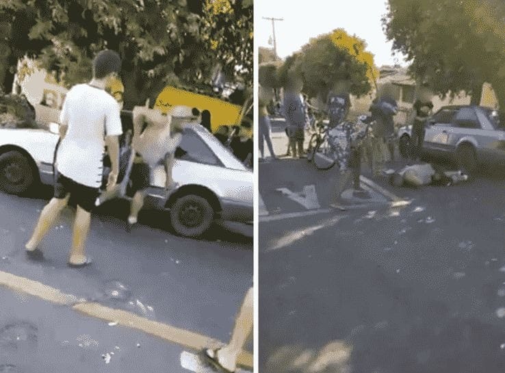 Um vídeo compartilhado nas redes sociais mostra o momento em que o homem desce do carro com um porrete para defender o filho que estaria sendo alvo de bullying.