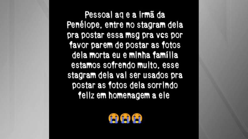 “Pessoal, aqui é a irmã da Penélope. Entrem no Instagram dela pra postar essa mensagem, por favor parem de postar as fotos dela morta, eu e minha família estamos sofrendo muito”, escreveu.