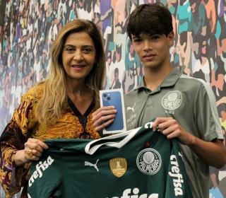 Jogador das categorias de base do Verdão, Felipe Goto visitou as dependências da Academia de Futebol ao lado do pai, e foi presenteado por Leila Pereira com um celular novo.