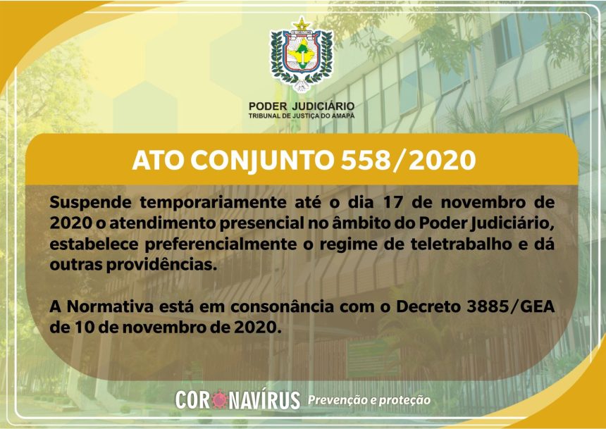 O Ato Conjunto nº 558/2020, editado pelo Tribunal de Justiça do Amapá (TJAP) nesta quarta-feira (11), prorroga a suspensão do atendimento presencial no âmbito do Poder Judiciário até o dia 17 de novembro, em face do agravamento da pandemia da COVID-19. Estabelece também o regime de trabalho remoto como preferencial e dá outras providências. A Normativa está em consonância com o Decreto 3885 do Governo do Estado do Amapá de 10 de novembro de 2020.