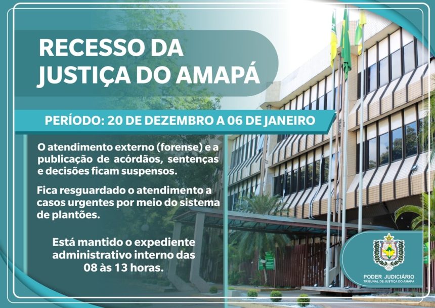 O Tribunal de Justiça do Amapá (TJAP) comunica a toda a sociedade amapaense as condições gerais de atividade e atendimento durante o Recesso Forense, que tem início no dia 20/12 e final em 06 de janeiro. O retorno das atividades ocorre no dia 07 de janeiro, mas os prazos processuais continuam suspensos até o dia 20 do mesmo mês – isso vale para processos cíveis, criminais, audiências e sessões de julgamento, mas as audiências de conciliação não serão afetadas. O Recesso Forense na Justiça do Amapá obedece às seguintes normativas: Resolução nº 1330/2019Ato Conjunto nº 416/2016Ato Conjunto nº 422/2017Ato Conjunto nº 433/2017 e Ato Conjunto nº 451/2017.