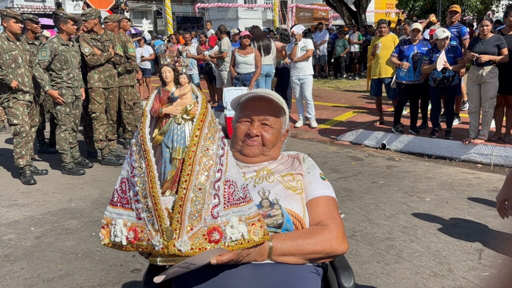 A aposentada Maria de Nazaré Pascoal, de 94 anos, xará de Nossa Senhora, é uma devota fervorosa da Nazinha. Ela veio de Natal, no Rio Grande do Norte, para participar do Círio em Macapá. Acompanhada dos filhos, netos e bisnetos, enfrentou o sol e o calor para demonstrar sua fé e sua devoção.