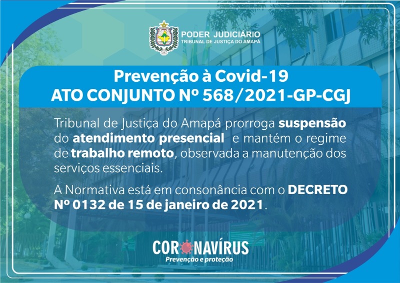A Presidência e a Corregedoria-Geral de Justiça do Tribunal de Justiça do Amapá (TJAP) assinaram o Ato Conjunto nº 568/2021-GP-CGJ, que prorroga até 19 de Janeiro de 2021 a suspensão do atendimento presencial de partes, advogados e interessados em todas as unidades judiciais e administrativas do Tribunal de Justiça do Estado do Amapá. A normativa também mantém, preferencialmente, o regime de trabalho remoto, em virtude da necessidade de continuidade na adoção de medidas restritivas e de prevenção para evitar a proliferação do contágio do novo coronavírus. A medida prorroga os efeitos do Ato Conjunto anterior sobre o tema (nº 555/2020) e segue em consonância com as determinações do Poder Executivo Estadual, no Decreto 0132/2021.