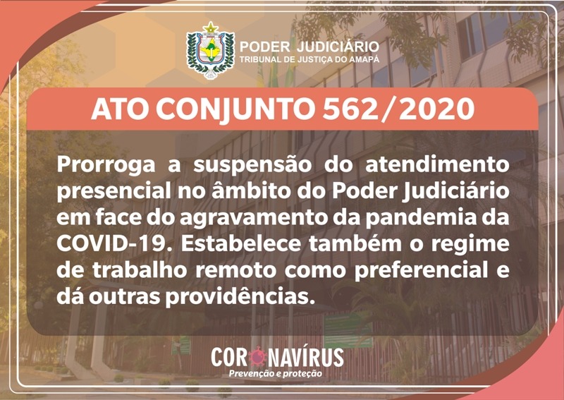 De acordo com o Ato Conjunto nº 562/2020-GP-CGJ, editado nesta quinta-feira (03), fica prorrogado até o dia 18 de dezembro, no âmbito do Poder Judiciário do Amapá, o prazo de vigência do Ato Conjunto nº 555/2020, que versa sobre a suspensão do atendimento presencial nas unidades judiciárias e administrativas mediante a curva crescente de contaminação pelo novo coronavírus, bem como adota o regime de trabalho remoto, como preferencial, observadas as atividades essenciais.