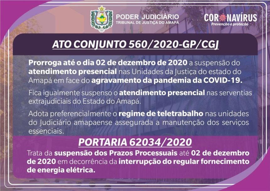 O Ato Conjunto nº 560/2020-GP/CGJ, editado pelo Tribunal de Justiça do Amapá (TJAP) nesta quarta-feira (18), prorroga a suspensão do atendimento presencial no âmbito do Poder Judiciário, bem como adota o regime de trabalho remoto, como preferencial, para magistrados, servidores, estagiários e colaboradores (assegurada a manutenção dos serviços essenciais) até o dia 02 de dezembro, em face do agravamento da pandemia da COVID-19. O Ato Conjunto, em seu parágrafo único, determina que fica igualmente suspenso, pelo mesmo prazo, o atendimento presencial nas serventias extrajudiciais do Estado do Amapá, mantidas as demais disposições constantes no Provimento n° 0396/2020-CGJ. Já a Portaria 62034/2020, editada hoje (18), trata da suspensão dos Prazos Processuais, também até 02 de dezembro, em decorrência da interrupção do regular fornecimento de energia elétrica.